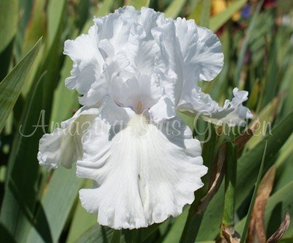 Superb giant ruffles on a clean white flower. White beards. Hybridizer, Ghio 84.