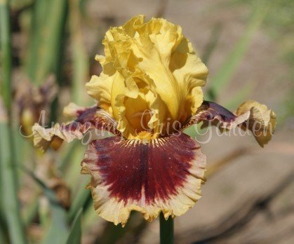 Butterscotch standards Broad mahogany falls, with wide tan band. Old gold beards. Large bloom Hybridizer, Blyth 2001.
