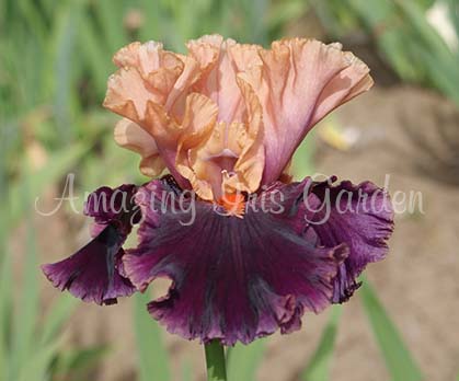 Buff standards infused purple at midrib, velvety black cherry falls with cream rim. Orange beards. Hybridizer, T Johnson 2001.