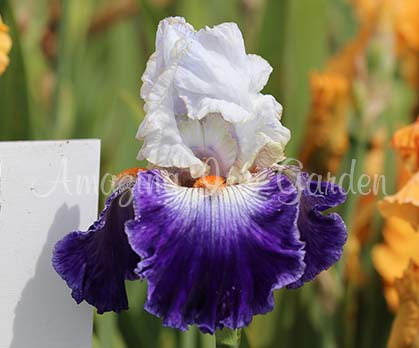 Cool white stds, rich blue/violet falls, lightened by a pale lavender rim. Tangerine beard. Hybridizer, Shoop 1997.