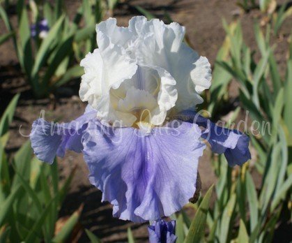 Near white standards, round flaring medium blue falls. White beards. Vigorous grower 8-10 buds. Hybridizer, Lauer 1993.