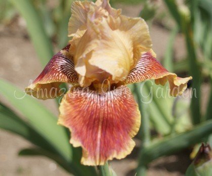 S. buff; F. buff, overlaid and veined red, edged buff; B. bronze. Hybridizer, Blyth 1976.