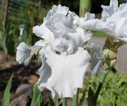 Standards ruffled pale blue white. Falls heavily ruffled pale blue white. Beards white. Hybridizer, Baldwin 1984.