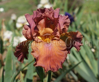 Wide ruffled copper/henna/maroon standards & falls. Gold beard. Hybridizer, Schreiner 1985.