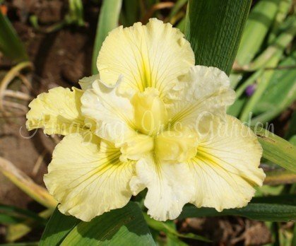 Soft lemon white with green veining. Falls with lime green raised steeple signal veined lime green; style arms soft butter lemon; ruffled. Hybridizer, H Pryor 1997.