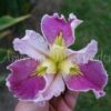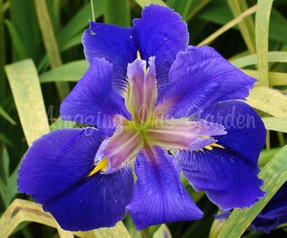 S. Cobalt blue, style arms cream, with lime base, violet blue tip. F. Deep cobalt blue, pale cream rim, white blotch overlaid with golden steeple signal, very deep cobalt blue surrounding area. Ruffled. Hybridizer, H Pryor 2003.