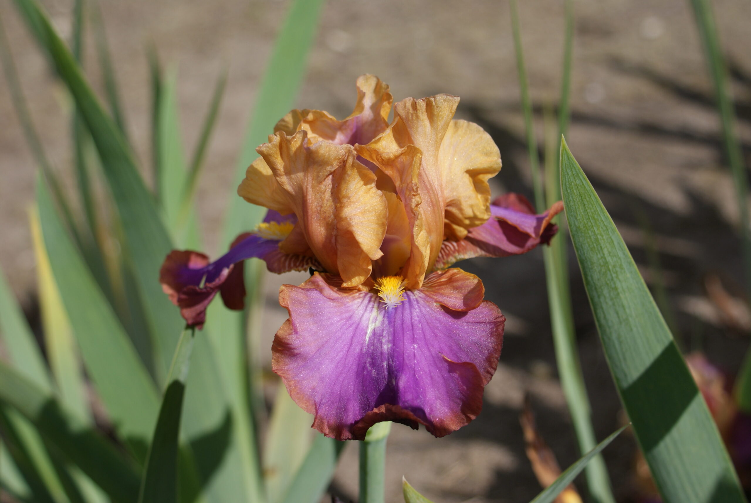 Golden tan standards flushed orchid. Orchid fuchsia falls rimmed in plum brown. Black 1989.