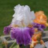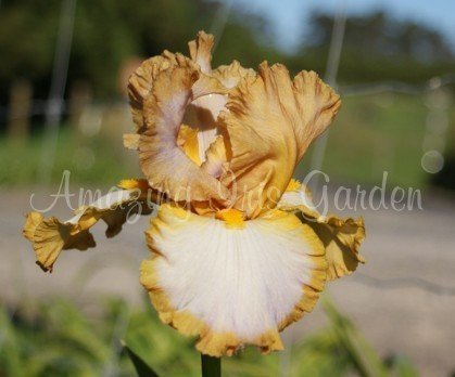 S. light tan brown; F. white, faint bluish lavender blush, brown border; B.bright gold. Hybridizer, Blyth 1997.