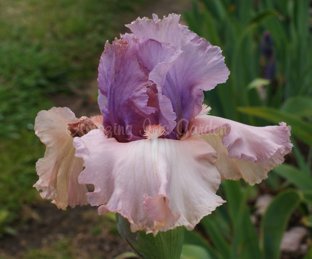 Standards purple blending to dusky pink at edges. Falls pink. Tangerine beards.