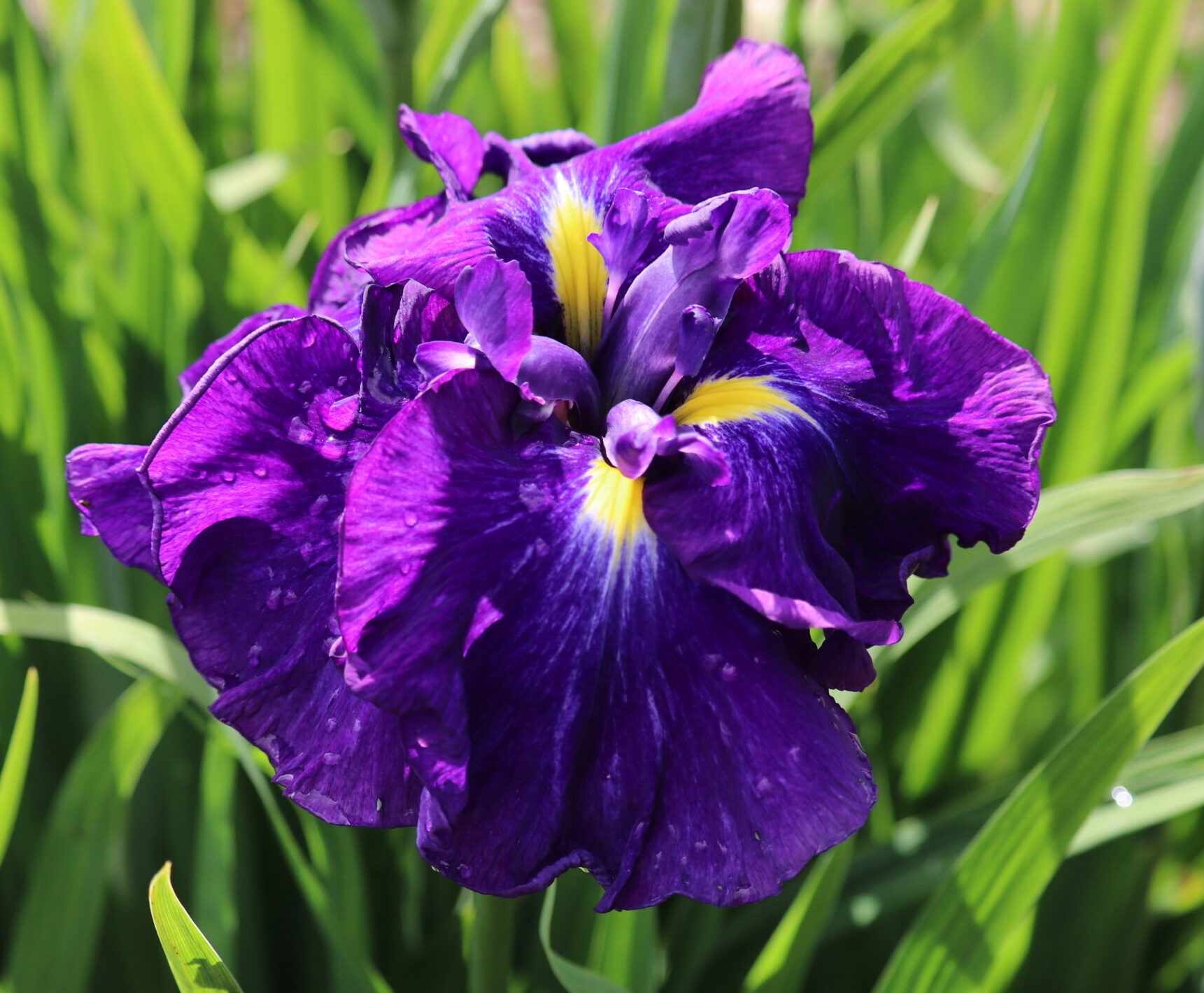 Red violet, veined darker at centre, lighter near white edges. Signal dark yellow, style arms white. Large white crests veined violet.