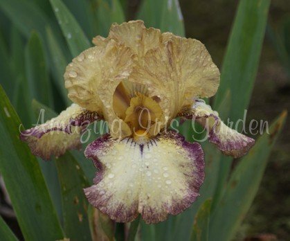 Buff/lemon ground plicata with a soft rose/purple border on the falls. Orange beards. Hybridizer, Innerst 1991.