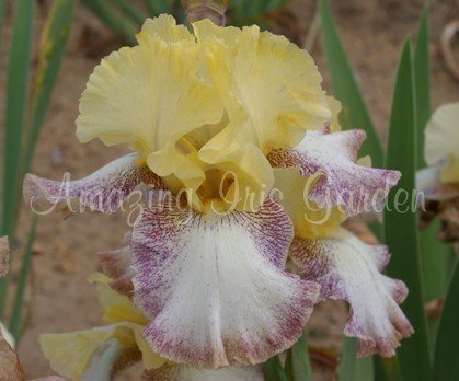 Lemon standards, white falls with light brown stitching on edge of falls. Beards yellow. Wide ruffled blooms. Hybridizer, Blyth 1981.