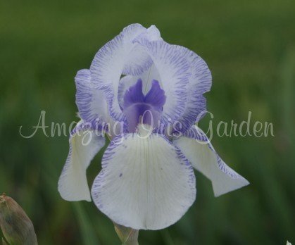 Smallish plicata, white ground stitched with blue/violet rims. Hybridizer, Cayeux 1906.