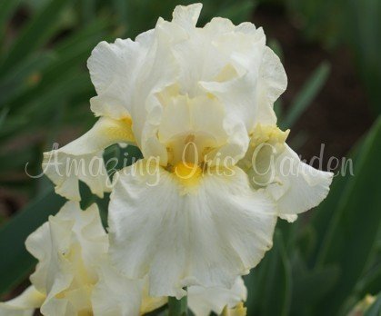 Snowy warm white standards & falls. Ruffled & rounded. Yellow beards. Hybridizer, Schreiner 1991.