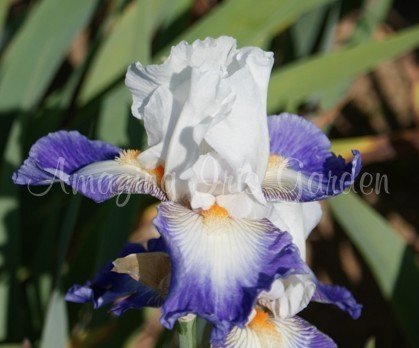 S. white; F. rich blue, with white patch below beard; B. orange. Hybridizer, Cayeux 1997.