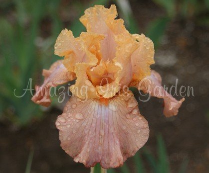 S.Light apricot; F. flushed violet/maroon; B. peach. Ruffled bi-colour. Hybridizer, Maryott 92..
