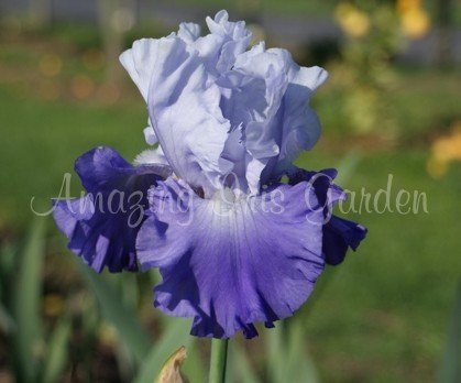 White standards, blue violet fall, with white flash around blue beard. Hybridizer, Lauer 2000.