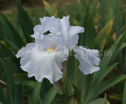 Ruffled pure white standards & falls; B. white. Hybridizer Grosvenor 1998.