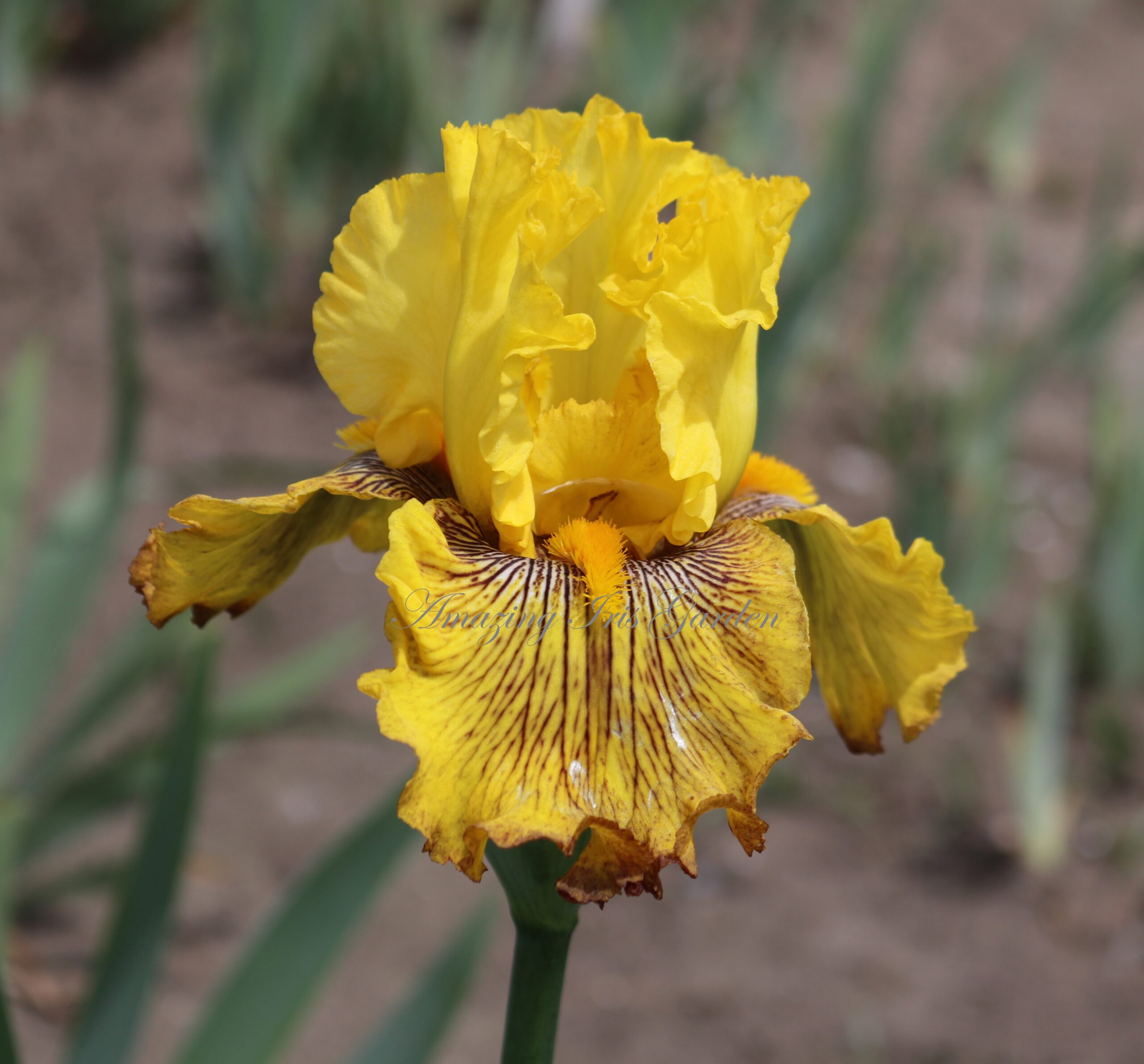 F. Vivid yellow, with dark red veins, heavier at hafts, with slight flush of white. Edges have fine line of dark red.